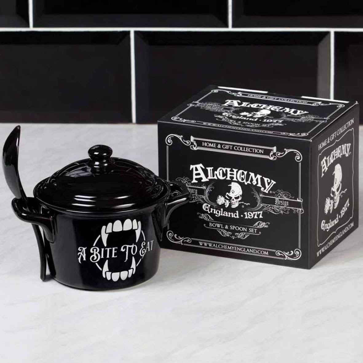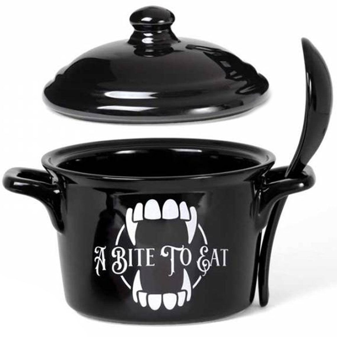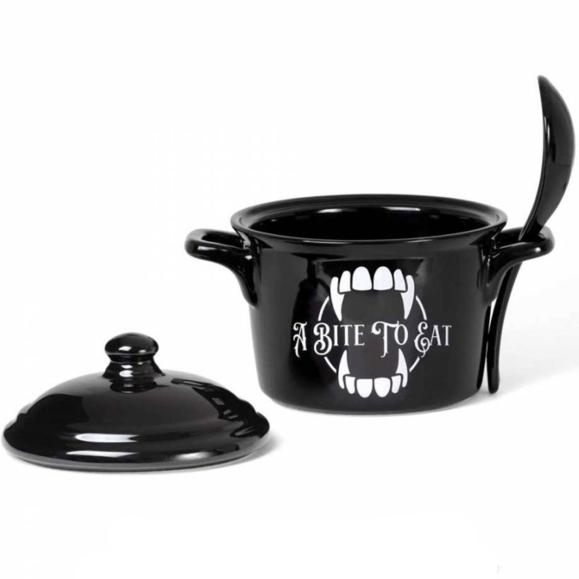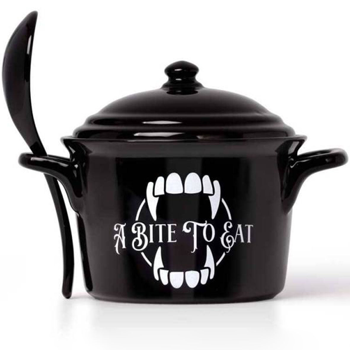Fancy 'A bite to Eat' .... Would you dare eat from a vampires pot? A unique lidded bowl and spoon set perfect to serve or slurp from! Alchemy designed cauldron inspired lidded bowl, complete with spoon. featuring unique original Alchemy artwork. Perfect for soups, broths, cereals and serving snacks.