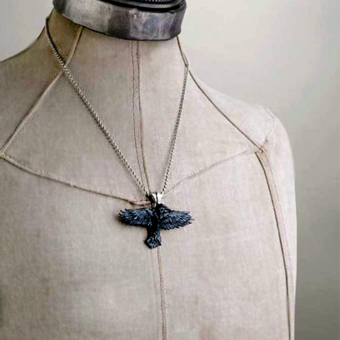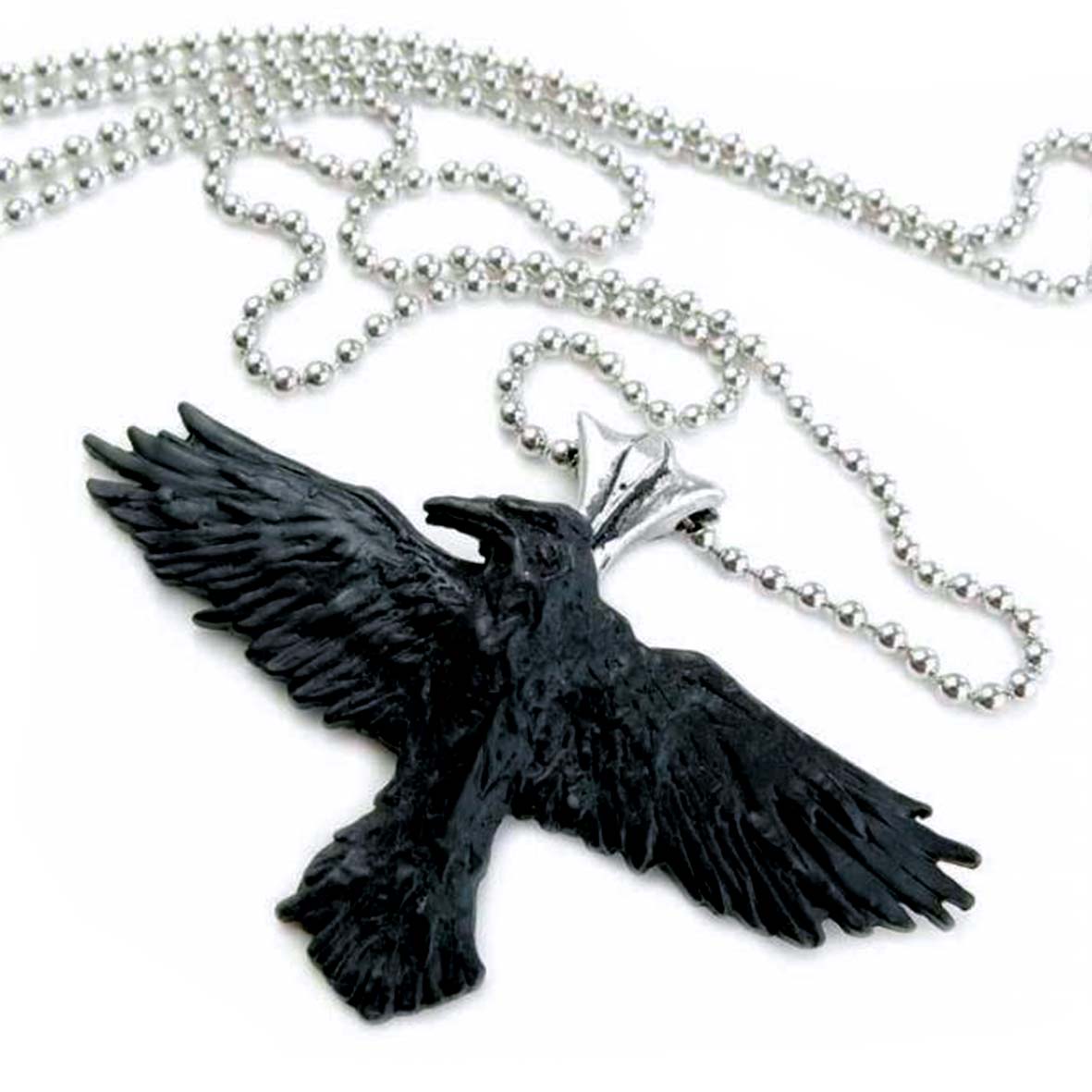 The Raven - the modern vampire and C.20th symbol of the undead. A subtle symbol of the undead, a two-tone pewter pendant with a black raven suspended from a polished bail and comes with a presentation box.