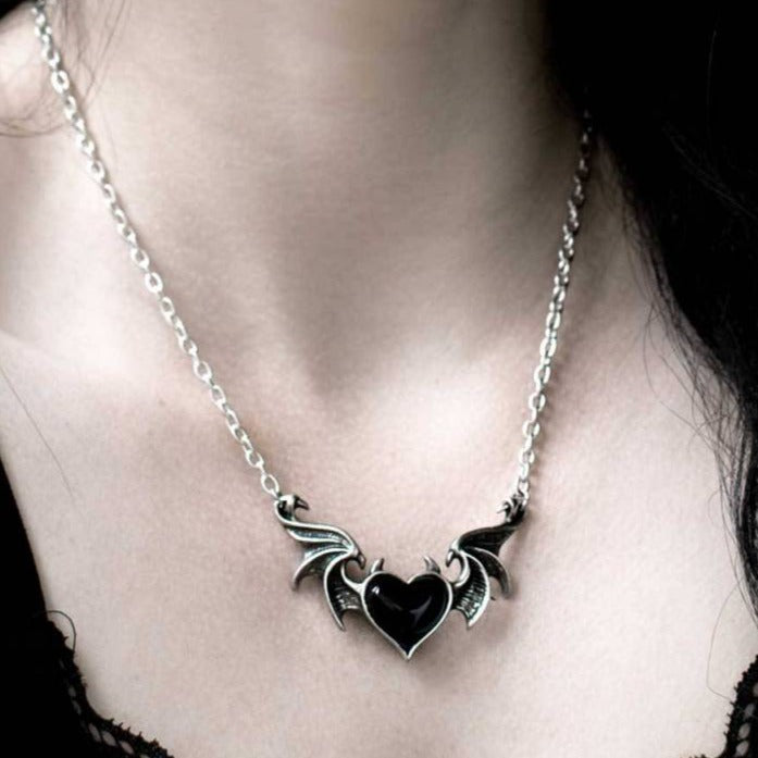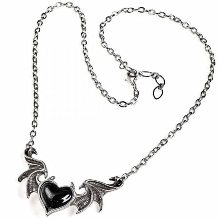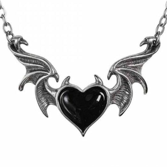 The black demon heart of a gothic seductress, nocturnally enticing her prey with ravishing enchantment. A dark statement piece for everyday wear. An enamelled black heart with horns, between the outstretched flying wings of a demon. A necklace upon a split trace chain 20" (50cm) overall plus a 1 ½" extender chain.