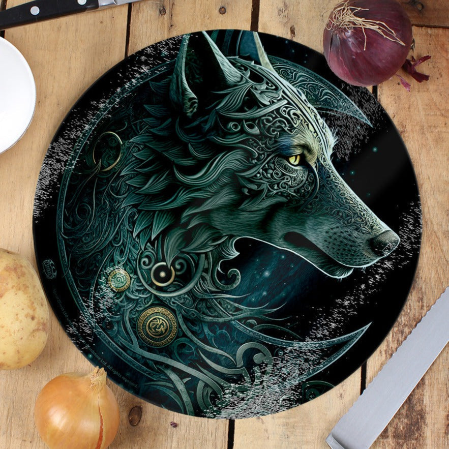 Inspired by the Norse legend of Fenrir, this intricate wolf design is one for the fearless warriors amongst us. Fenrir is depicted howling to the sky, encompassed in armour plating and Celtic knotwork, ready to leap into battle. These glass chopping boards are made to the highest standard, perfect for meal preparation. Containing beautiful artwork these chopping boards are made from toughened glass and are completed with rubber feet to stop them from sliding while being used. These pieces of art will be a great addition to your kitchen, just waiting for you to start chopping all your favourite foods on it. These glass chopping boards can also be used as surface protectors or just to have to make your kitchen look more awesome.