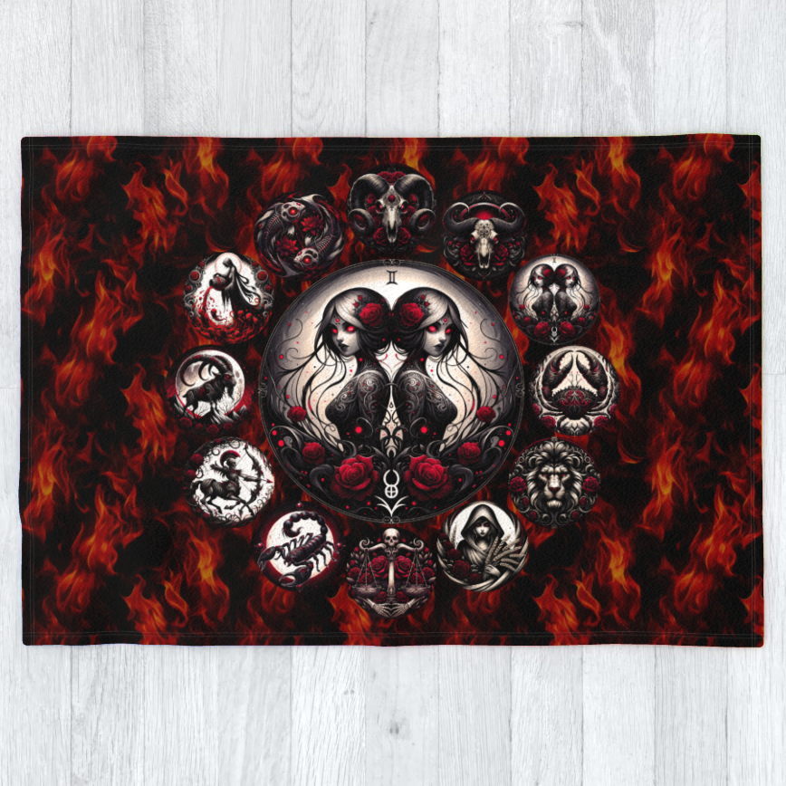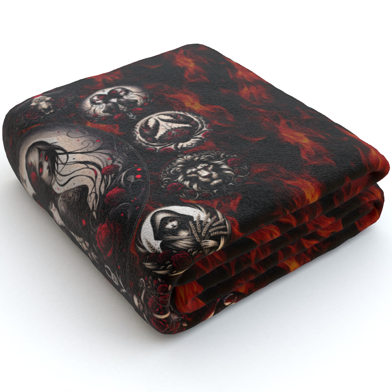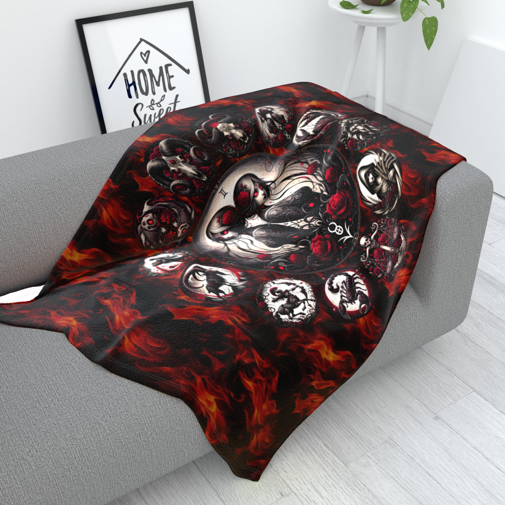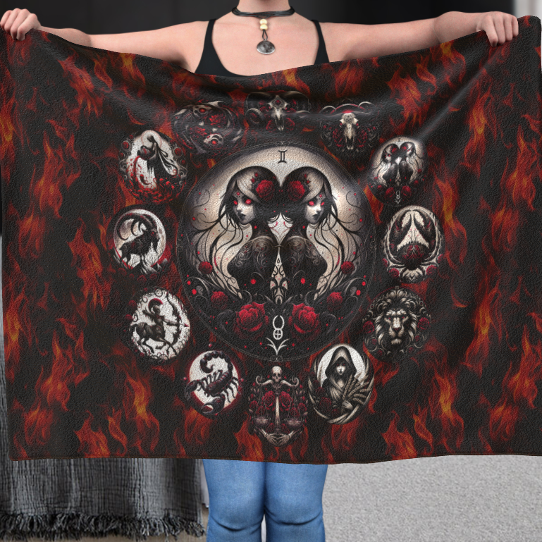 This blanket is part of the Hell's Zodiac collection. Hell's Zodiac shows all the stars signs as seen from hell, with death and fire, it represents true gothic astrology. Time to cosy up with your favourite blanket. This soft and snuggly plush fleece blanket is lightweight and comforting, good for wrapping up in on cold evenings. This blanket can be used as a great throw for a bed or sofa to give the room an awesome look. This blanket can also be taken on picnics or to the beach to make your own personal unique space.
