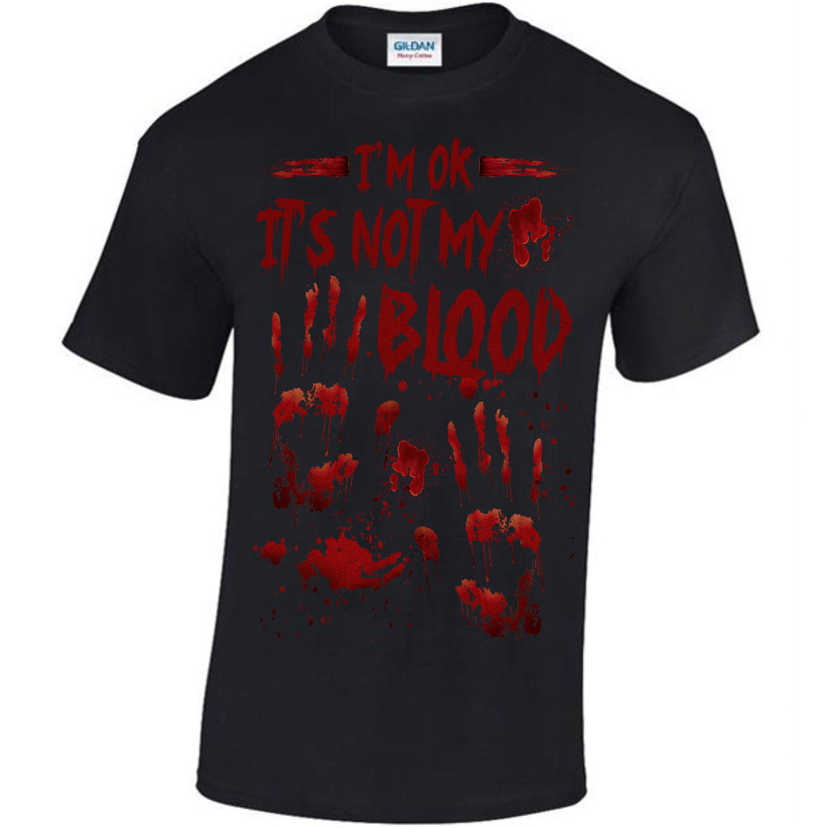 This t-shirt is from the It's Not My Blood Collection. Sometimes even homicidal psychopaths need to explain all the blood. When killers get blood on their hands they need to make sure their friends know that they won and their OK.