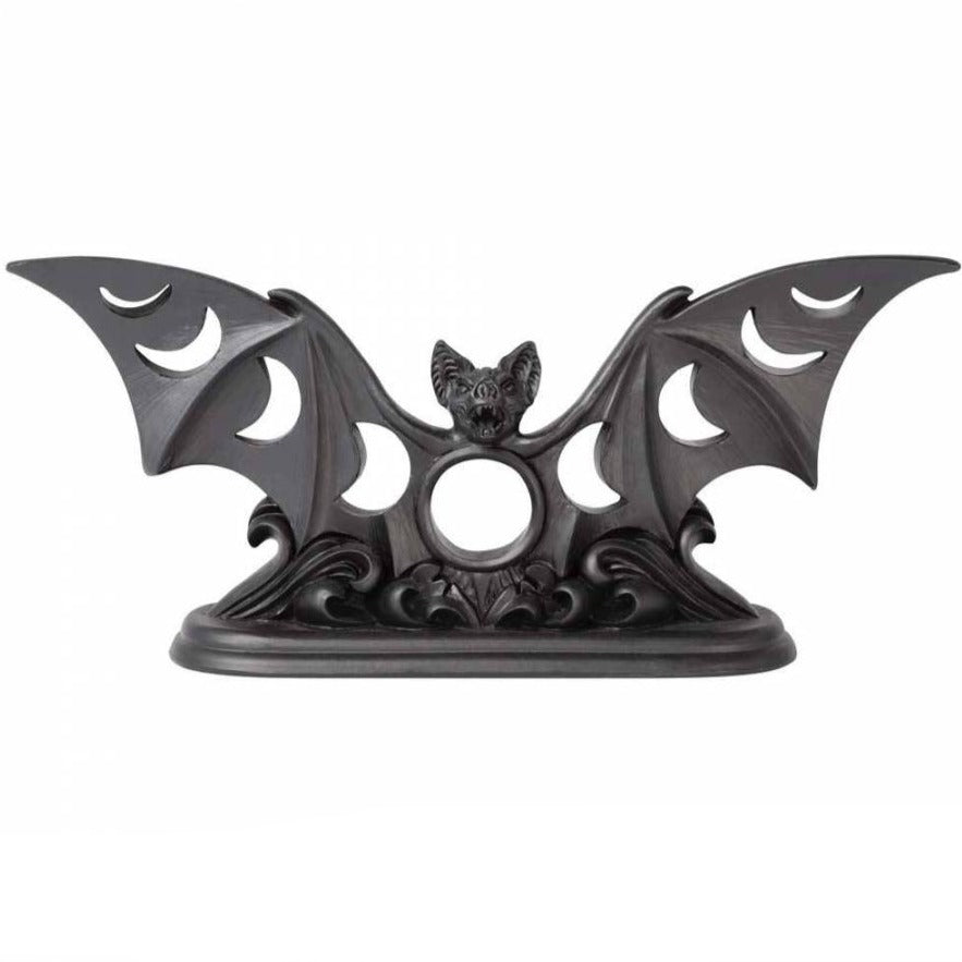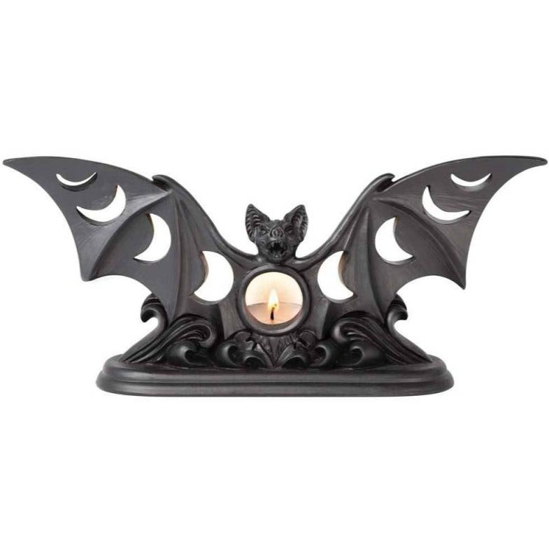 Crepuscular apparition, summoned by devotion and conjured in the temple of Artemis at the dark of the moon. The most darkly beautiful bat tea light holder which will cast shadows of the moon phases around your abode. A bat shaped tea light holder with phases of the moon cut out detail.