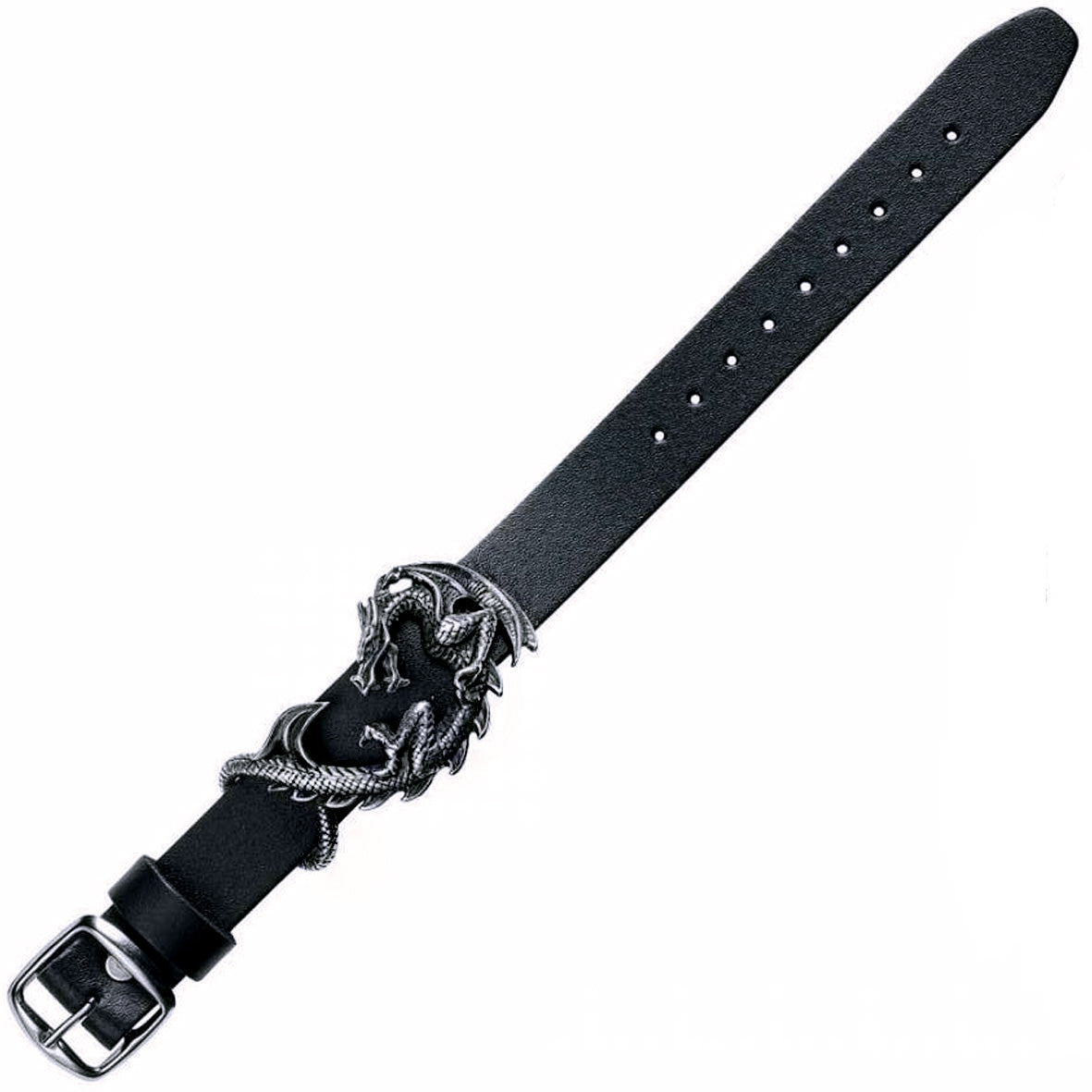 The frenzied roiling of the ravening spiniferous creature highlights the peril of danger when harbouring such chaotic companions. A ¾ inch (20mm) wide black leather wrist strap supporting a 3D-sculpted, polished pewter writhing dragon, whose tail wraps around the strap which has a buckle fastening.