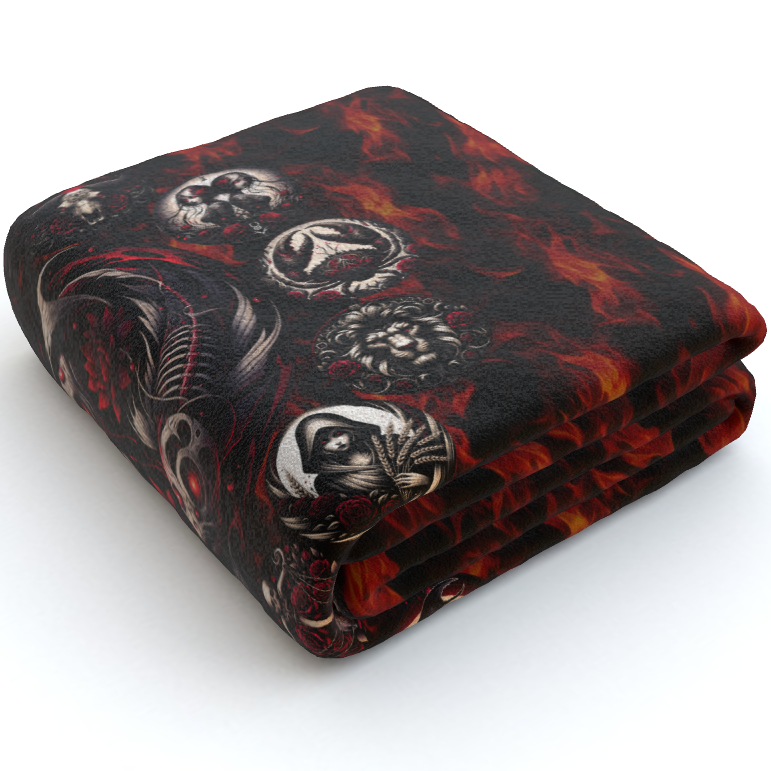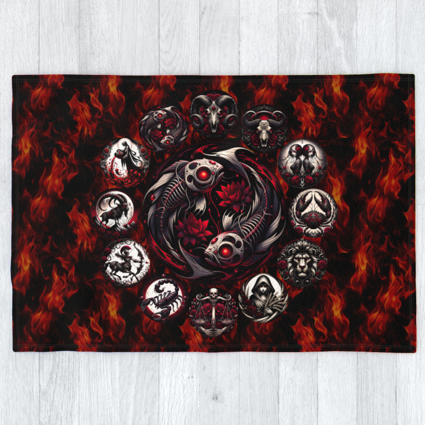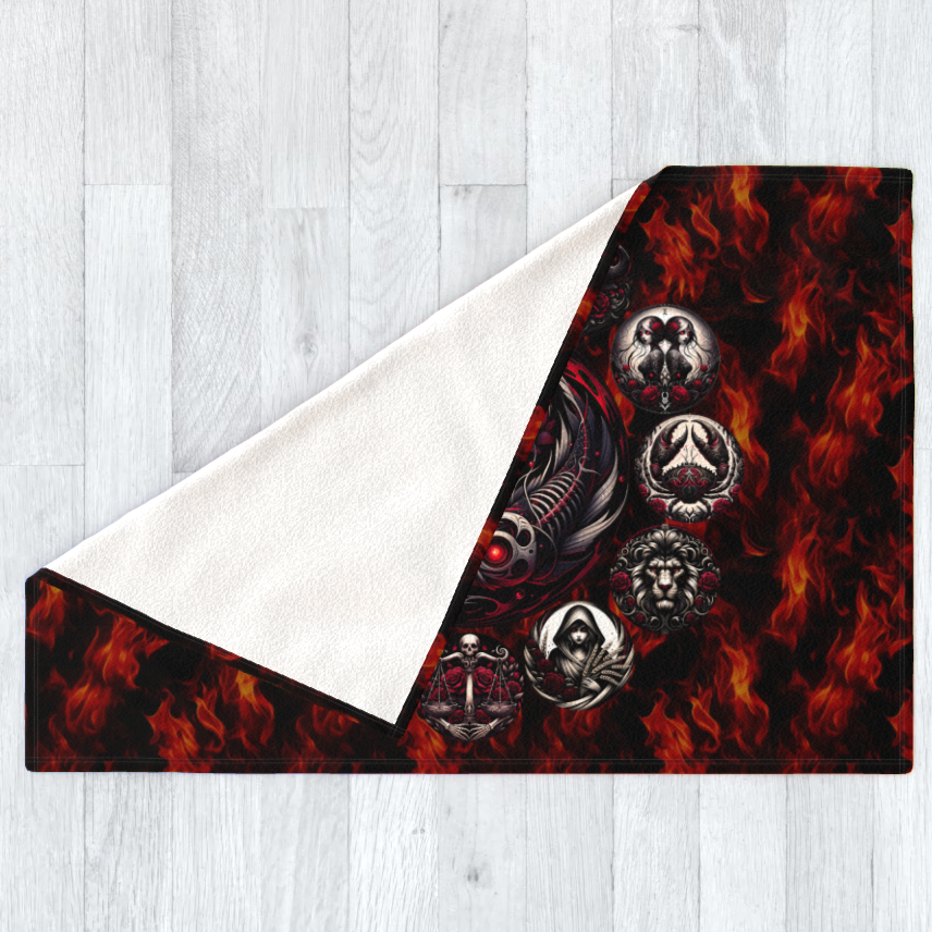 This blanket is part of the Hell's Zodiac collection. Hell's Zodiac shows all the stars signs as seen from hell, with death and fire, it represents true gothic astrology. Time to cosy up with your favourite blanket. This soft and snuggly plush fleece blanket is lightweight and comforting, good for wrapping up in on cold evenings. This blanket can be used as a great throw for a bed or sofa to give the room an awesome look. This blanket can also be taken on picnics or to the beach to make your own personal unique space.