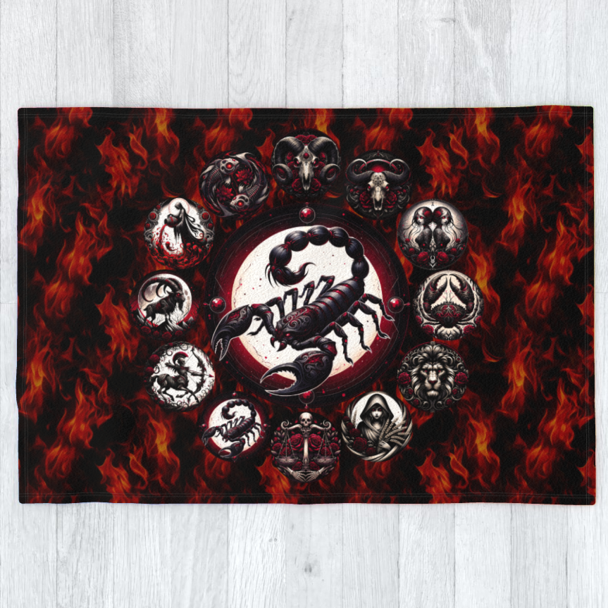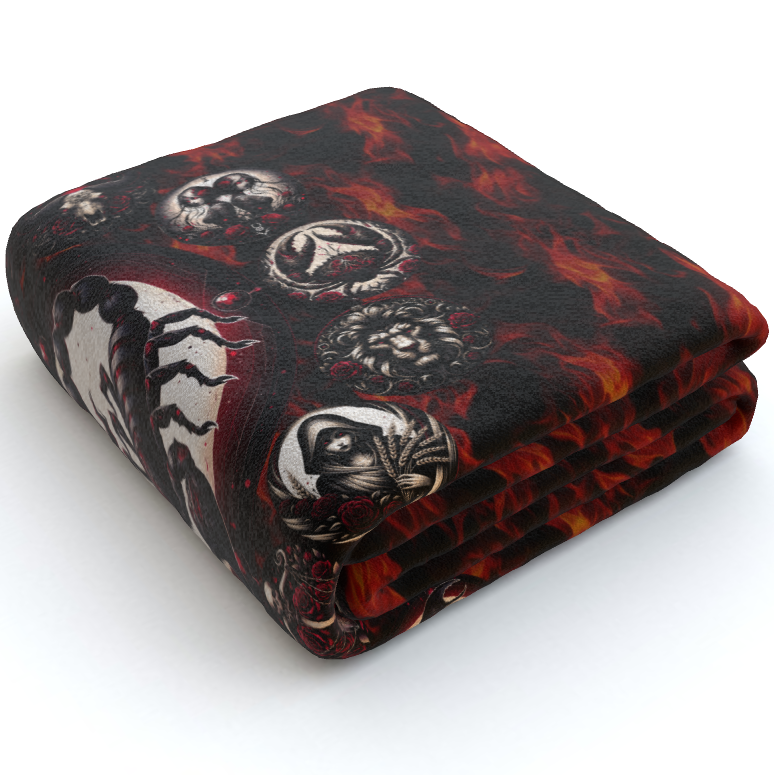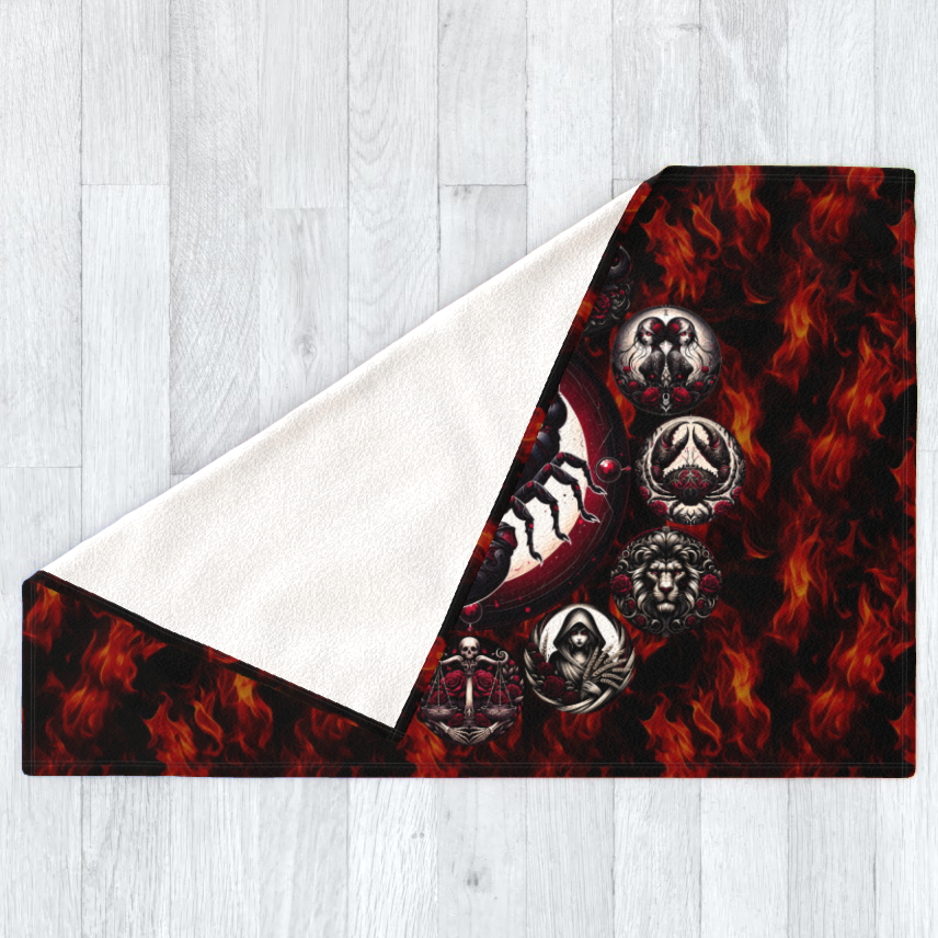 This blanket is part of the Hell's Zodiac collection. Hell's Zodiac shows all the stars signs as seen from hell, with death and fire, it represents true gothic astrology. Time to cosy up with your favourite blanket. This soft and snuggly plush fleece blanket is lightweight and comforting, good for wrapping up in on cold evenings. This blanket can be used as a great throw for a bed or sofa to give the room an awesome look. This blanket can also be taken on picnics or to the beach to make your own personal unique space.