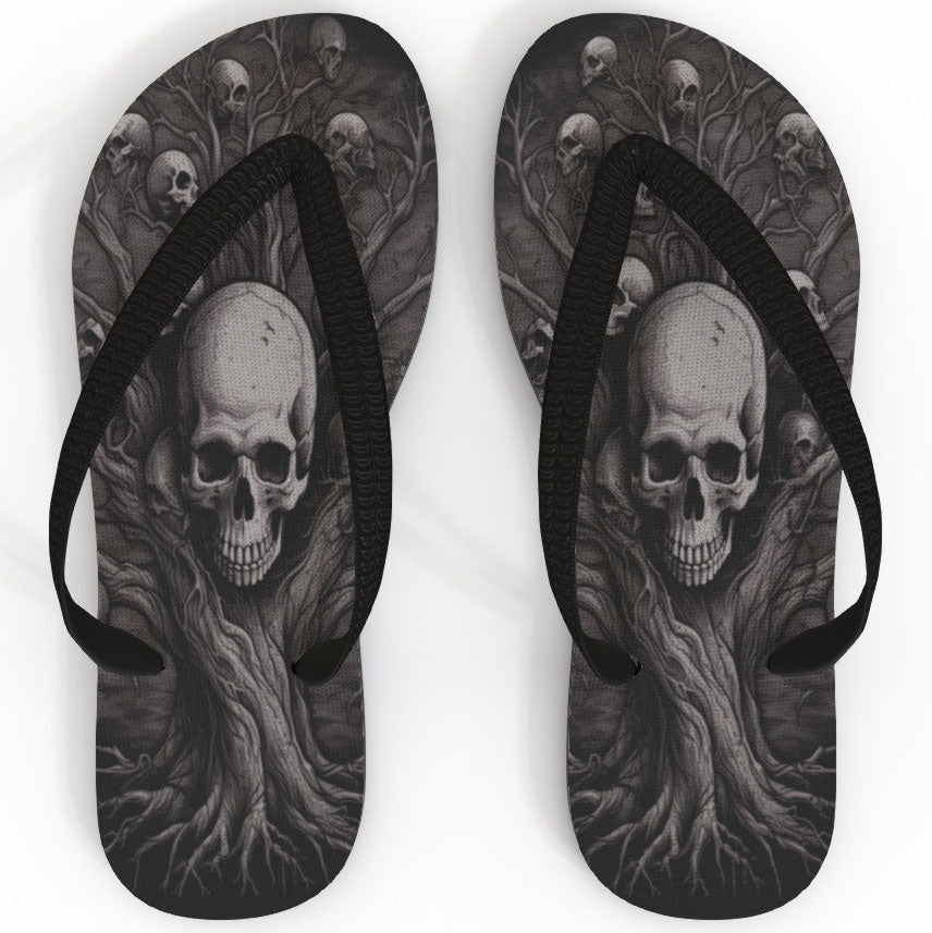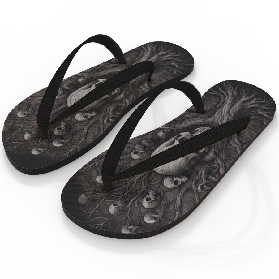 These flip flops depict the Tree of Death found in the shadow world. When you are lost in the shadow world the last place you want to find yourself is gazing upon this terrifying tree, your fear compels a scream to be released as the tree steals your soul. These flip flops are made to a high standard, they have the added bonus of being truly unique footwear. These flip flops are completed with great eye-catching artwork on them, making them different and standing out from regular footwear, great for going out on sunny days or taking on holiday for walking on the beach, a must have for sliding on after being in the swimming pool.