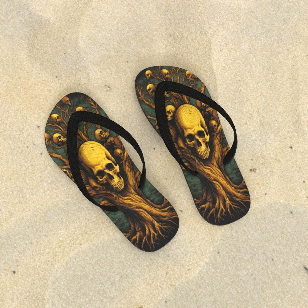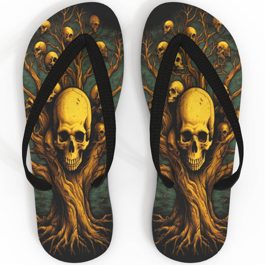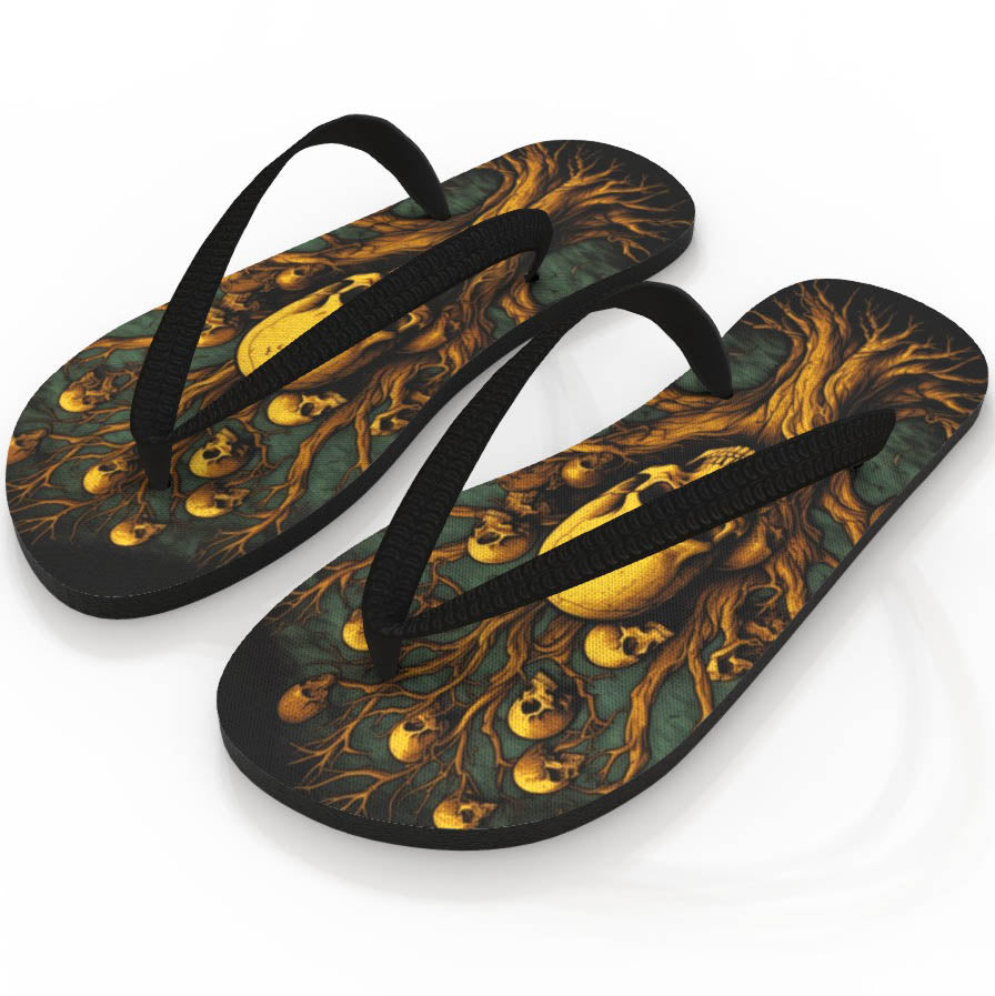 These flip flops depicts the Tree of Death full of collected souls. When you are lost in the woods the last place you want to find yourself in gazing upon this terrifying sight. This tree is covered in skulls and glowing with the souls that have been stolen from the innocent and guilty, for no-one is safe. Beware if you scream around this tree, it will steal your soul forever. These flip flops are made to a high standard, they have the added bonus of being truly unique footwear. These flip flops are completed with great eye-catching artwork on them, making them different and standing out from regular footwear, great for going out on sunny days or taking on holiday for walking on the beach, a must have for sliding on after being in the swimming pool.