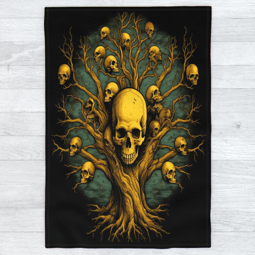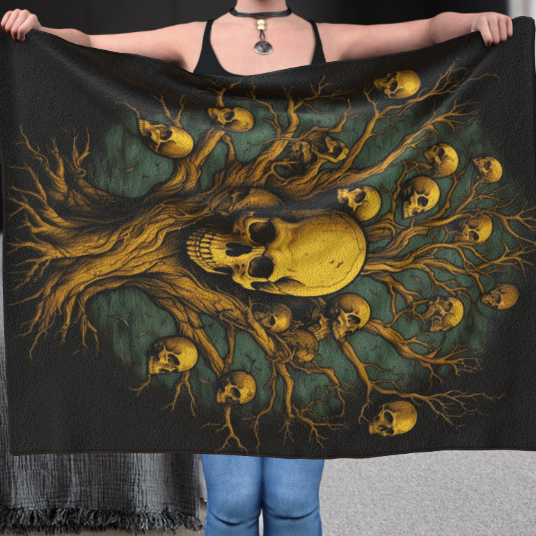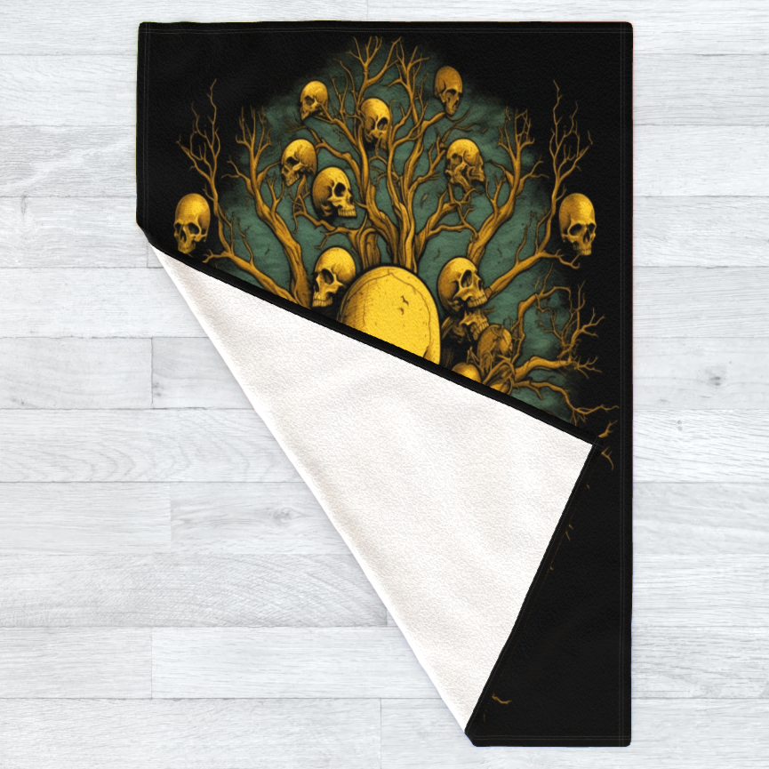 This blanket depicts the Tree of Death full of collected souls. When you are lost in the woods the last place you want to find yourself in gazing upon this terrifying sight. This tree is covered in skulls and glowing with the souls that have been stolen from the innocent and guilty, for no-one is safe. Beware if you scream around this tree, it will steal your soul forever. Time to cosy up with your favourite blanket. This soft and snuggly plush fleece blanket is lightweight and comforting, good for wrapping up in on cold evenings. This blanket can be used as a great throw for a bed or sofa to give the room an awesome look. This blanket can also be taken on picnics or to the beach to make your own personal unique space.