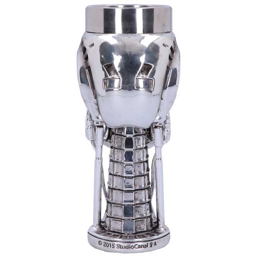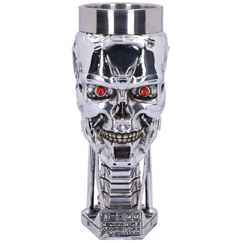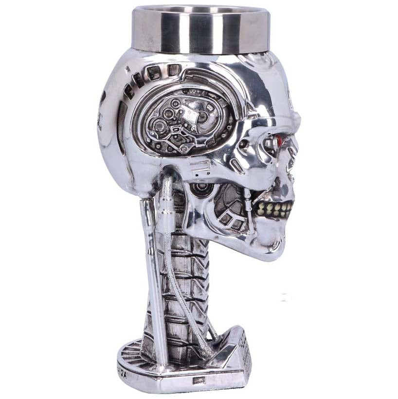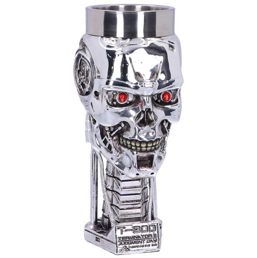 Sent back in time from the future, this officially licensed goblet was created by alternative brand Nemesis Now. This T-800 Terminator head has shed all human flesh, exposed hydraulics overlaid on a metallic skeletal structure that mocks humanity. Red eyes stare straight ahead unblinkingly. Cast in the finest resin before being carefully hand-painted, this features a removable stainless steel insert for ease of cleaning. The perfect way to keep your home safe from the android menace.