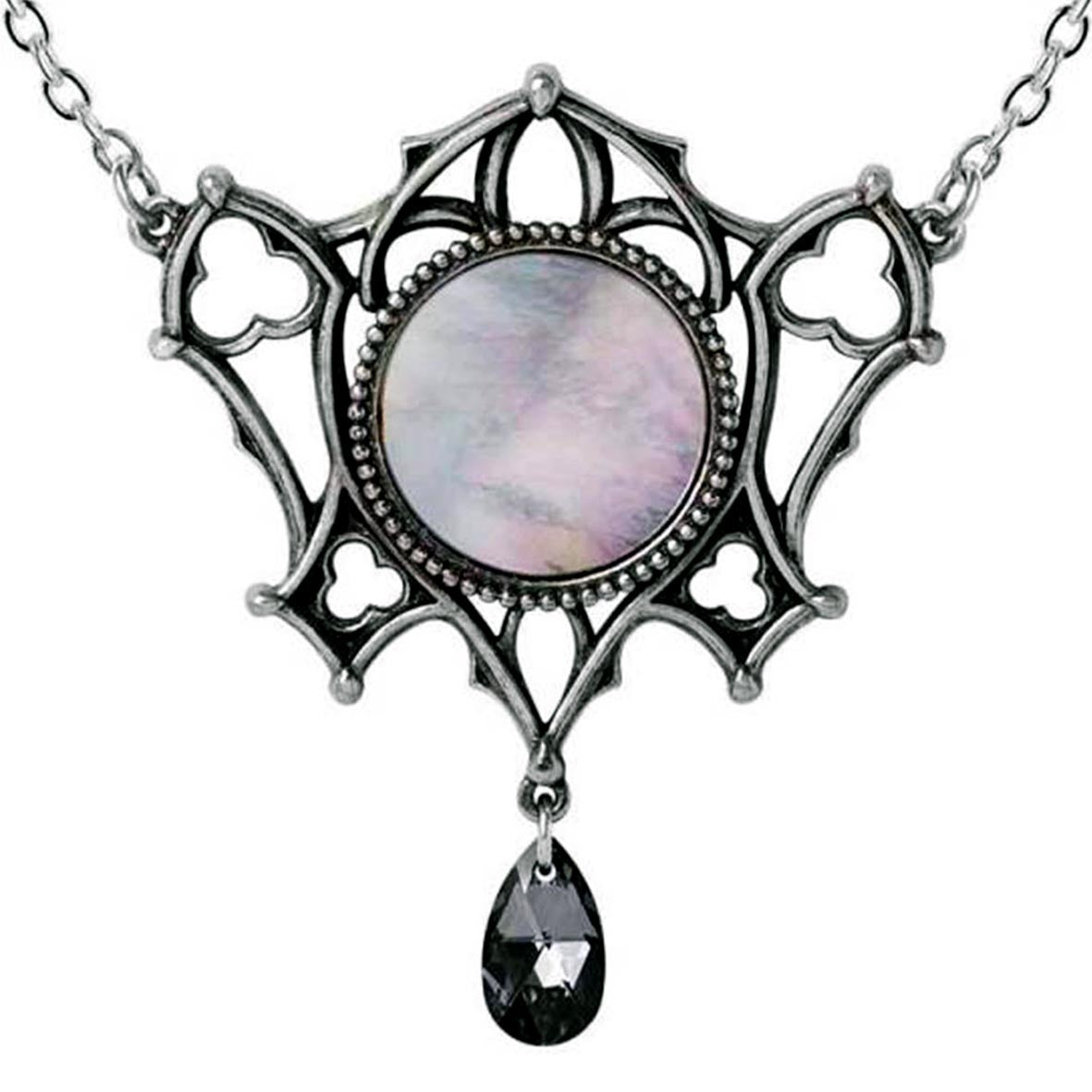 A statement necklace for your darkest occasions. Intricately detailed antiqued pewter, Gothic tracery holds a dark mother of pearl disc and finished with a stunning dark crystal hanging below.