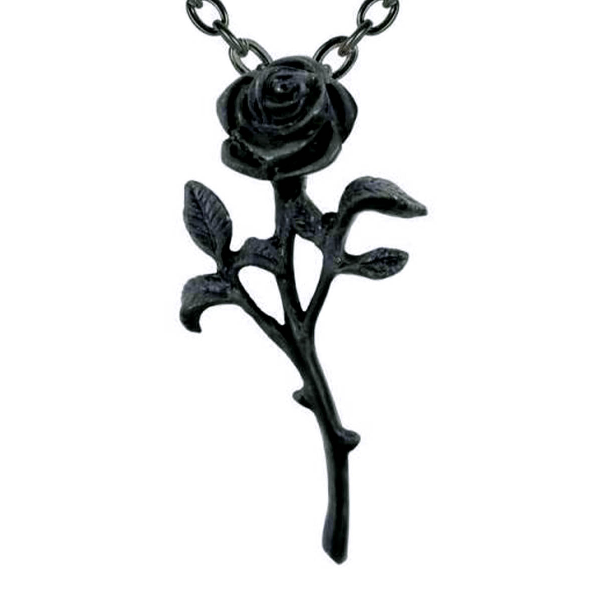 The mystery of darkness, the unachievable quest, the magic of perfection. The most desired and most unattainable bloom known to man, the black rose and gothic love, an impossible dream! A small black pewter rose pendant upon a black chain, in a black presentation box.