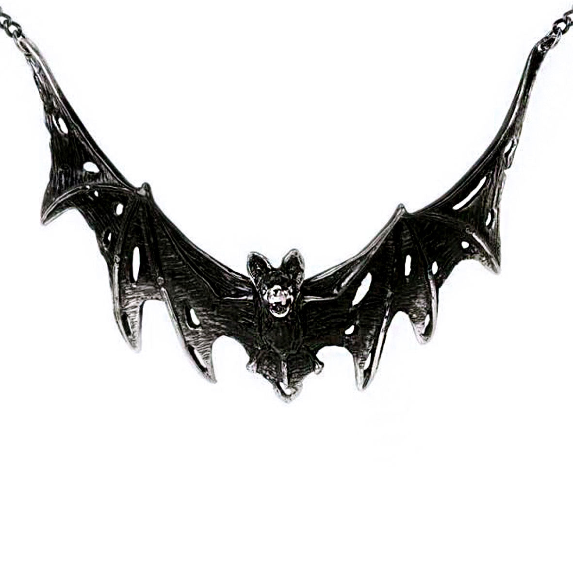 Flitting through the silent candlelit darkness of the solitary, stormbound lakeside manoir, unknowingly, the creature gives rise to the birth of the darkest and greatest of legendary tales. At Villa Diodati in May of 1816, Byron, Polidori and Mary Shelley contrived the eventual creation of both Frankenstein and Dracula. A faded dark pewter necklace depicting a ragged, spreadeagled, swooping bat.