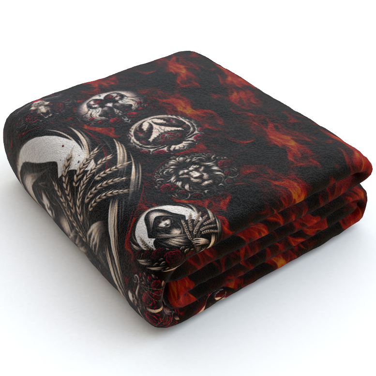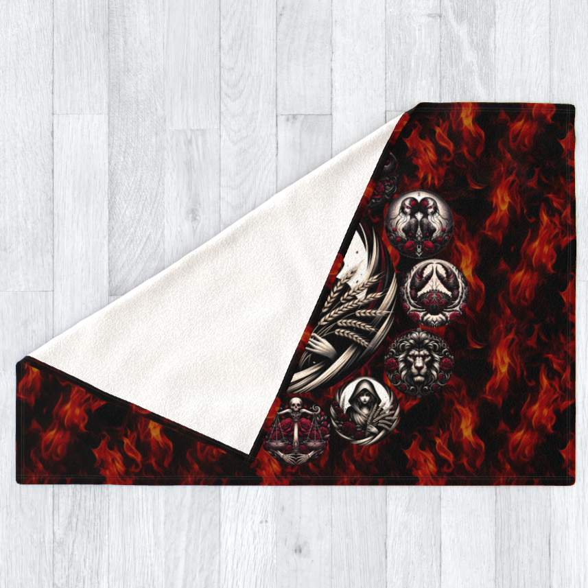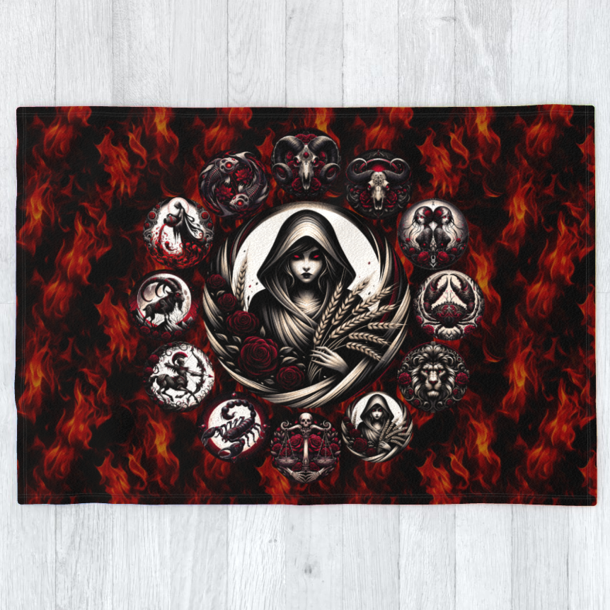 This blanket is part of the Hell's Zodiac collection. Hell's Zodiac shows all the stars signs as seen from hell, with death and fire, it represents true gothic astrology. Time to cosy up with your favourite blanket. This soft and snuggly plush fleece blanket is lightweight and comforting, good for wrapping up in on cold evenings. This blanket can be used as a great throw for a bed or sofa to give the room an awesome look. This blanket can also be taken on picnics or to the beach to make your own personal unique space.