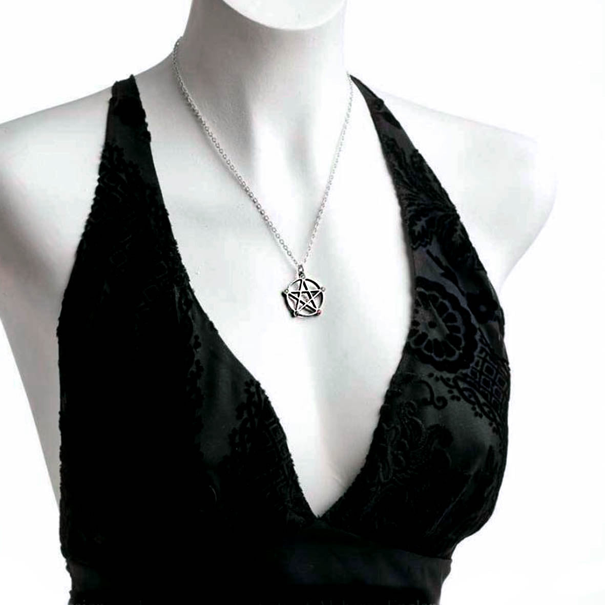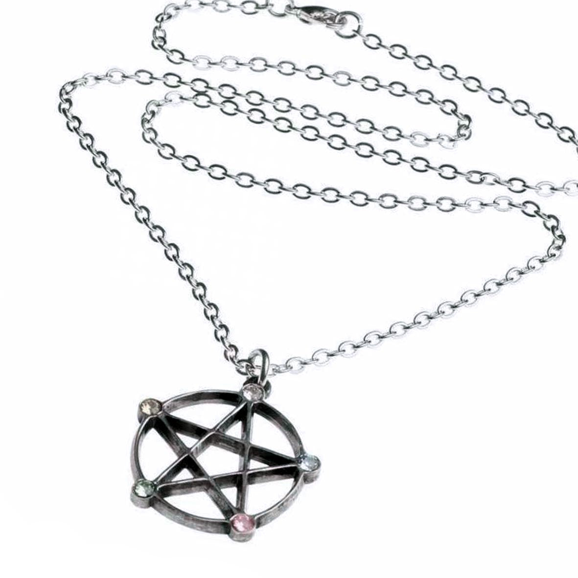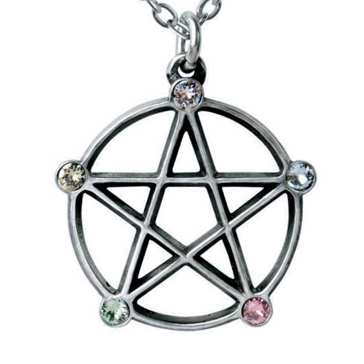 A fine, lightweight pewter pendant of a pentagram in a circle set with a small pastel-shaded crystal at each point, (sky blue, champagne pink, tea green, jasmine yellow and clear crystal), representing the colours of the five elements.