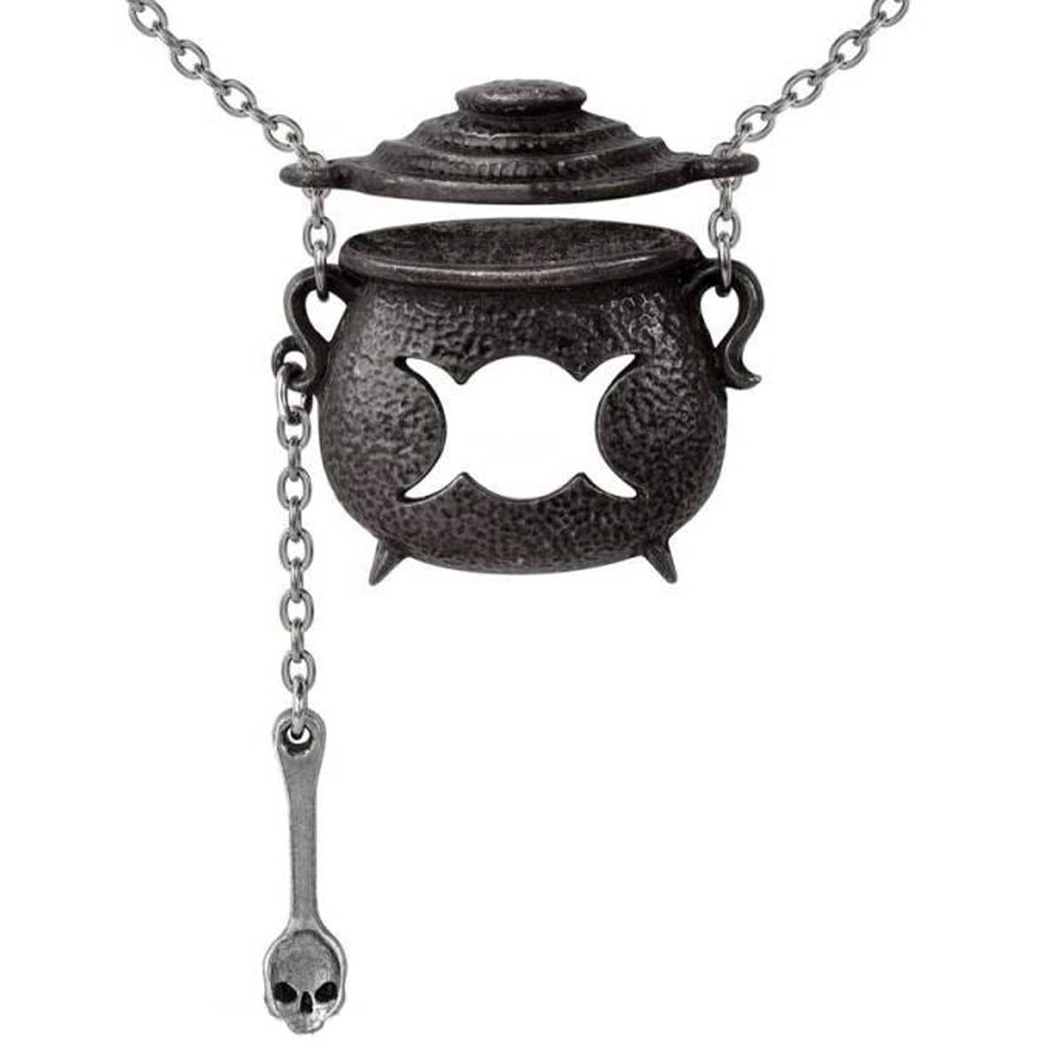 Mystically charmed, kettle black and stirring-up trouble again - a subtle expression of your uniqueness and remarkable talents. This piece will be at the top of any witches wish list! Magic up a special witchy treat! A miniature witches cauldron necklace, decorated with a cut out triple moon detail. Complete with movable lid and the sweetest ladle with skull detail!